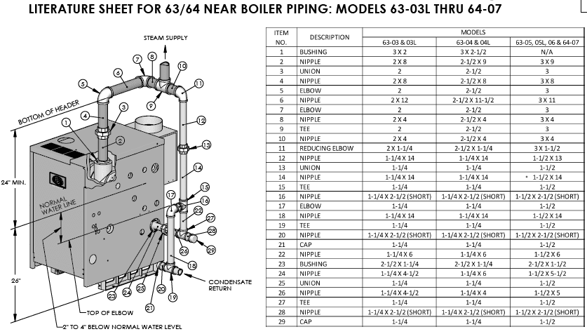 Save time and money with complete Near Boiler Piping Kits, available for Series 63™ and Series 64™ boilers. Each kit contains all components necessary (including Hartford Loop connections) for a seamless, worry-free installation. Three different kits are available for specific Series 63/64 boiler models.